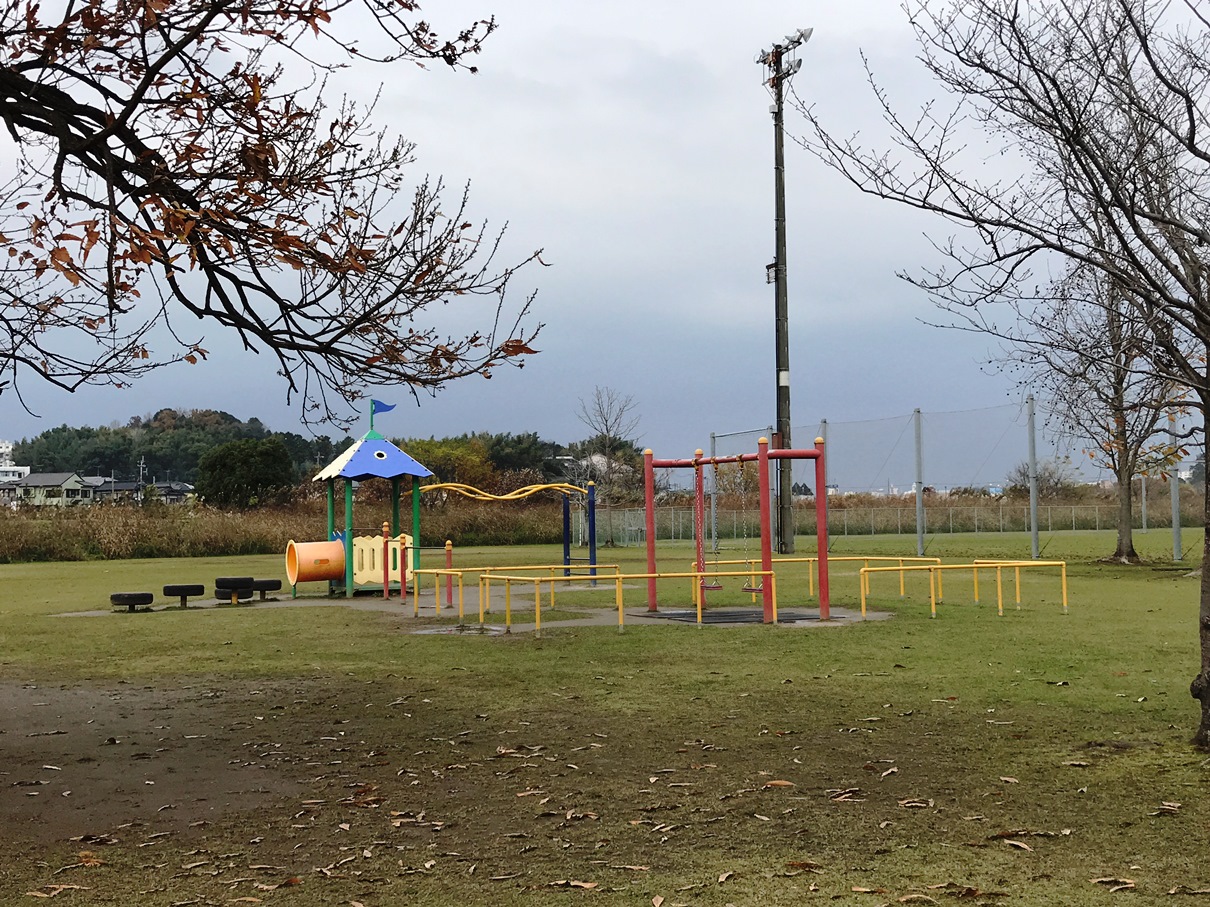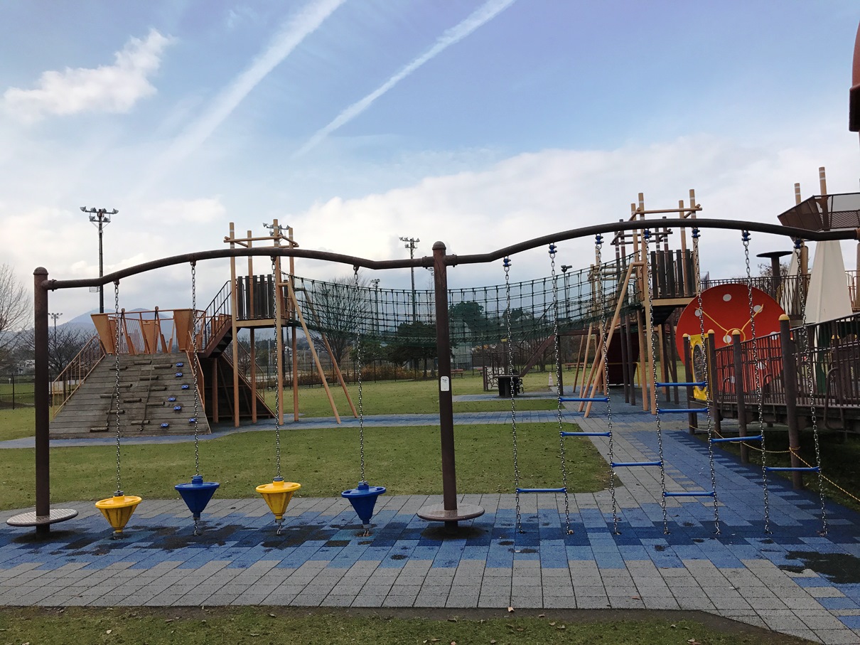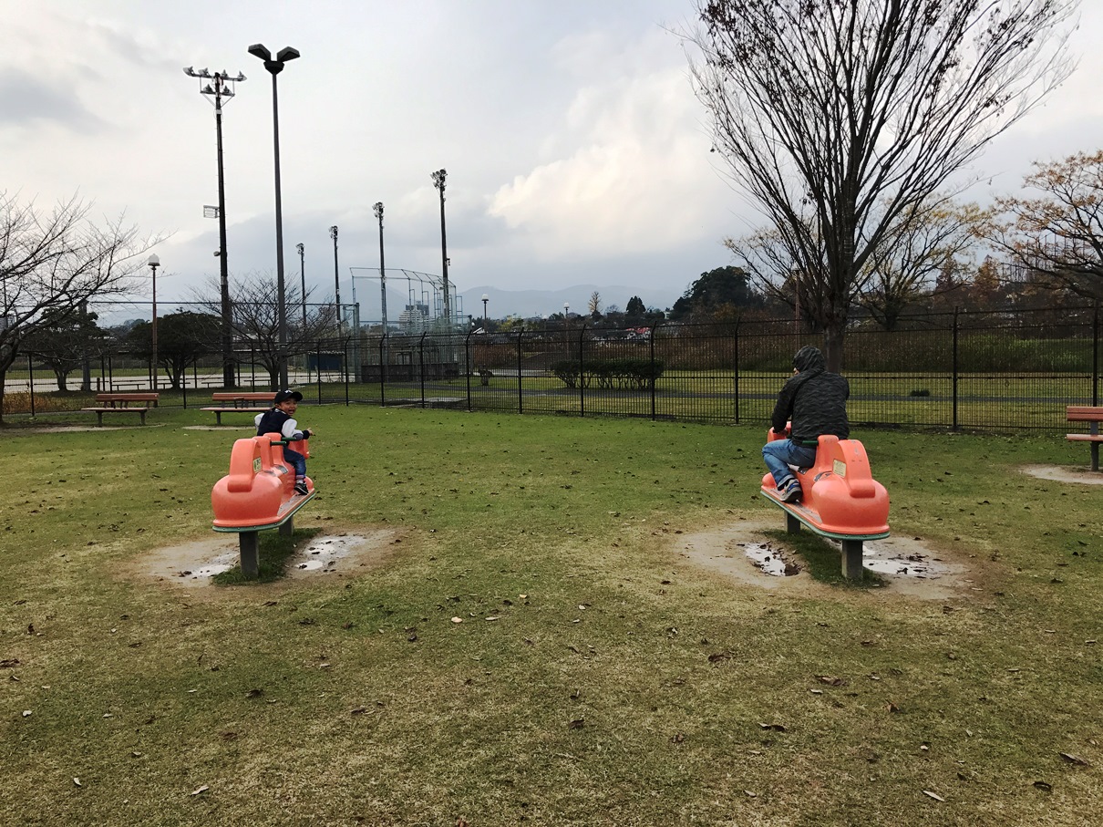 另外,公園內也有搖搖馬、盪鞦韆等遊具,這裡也很適合野餐,可以坐在公園的桌椅或是自備野餐墊,更可以看到熊本電車經過,輕鬆又自在。