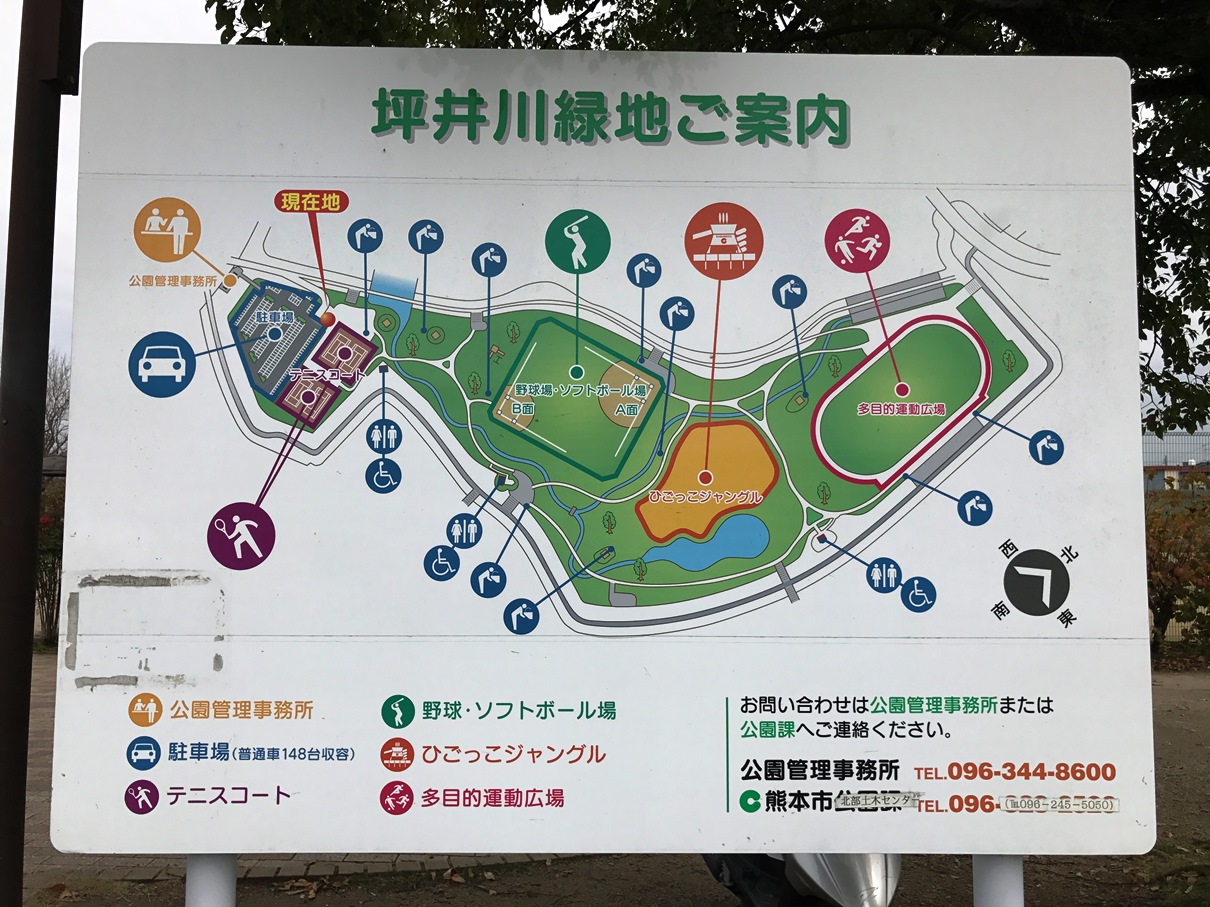 由於我們是自駕遊的關係,所以先將車子停泊在公園裡的無料駐車場(駐車場位於坪井川緑地公園管理事務所側),由駐車場到坪井川綠地公園大約5分鐘路程左右。沿路會看到路牌指示,跟著路牌「ひごっこジャングル」走就對了,所以不懂日文的我們都輕易找到公園所在地。